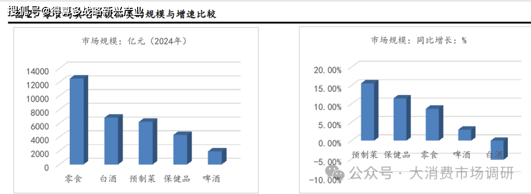按照Euromonitor、Frost & Sullivan 以及中国酒业协会的数据,2024 年,预制菜、保健品、白酒、啤酒和零食市场的发卖规模别离增加了15。6%、11。5%、-5。2%、3%和8。7%,零食市场的增加低于预制菜和保健品,但高于白酒和啤酒。